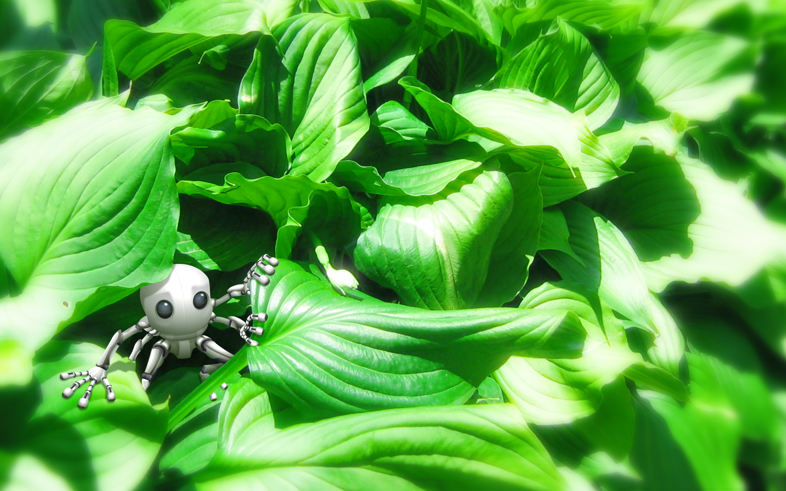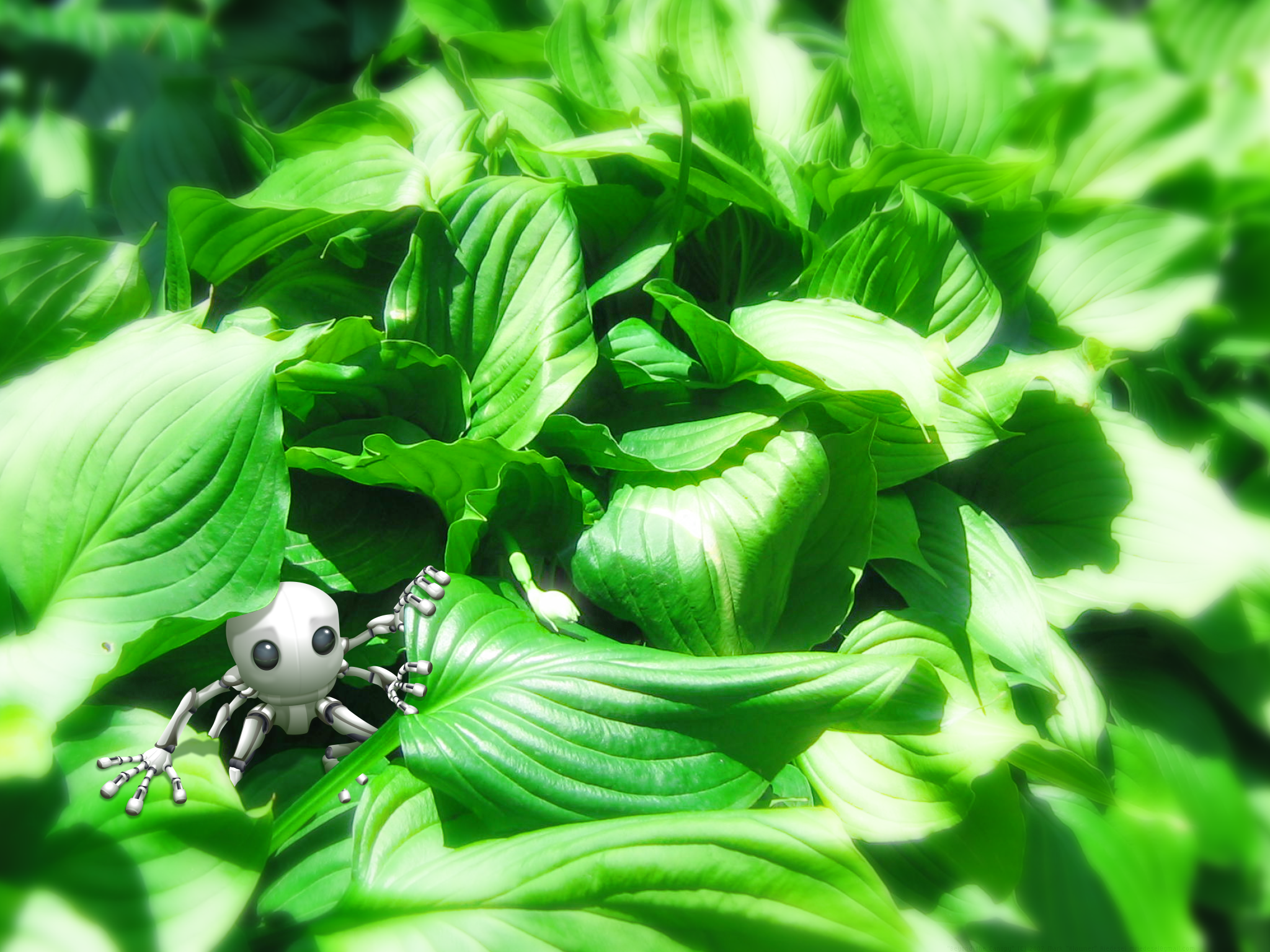 Photograph of hosta plants were snapped using my Canon PowerShot A80 in my back yard and then color adjustment using GIMP. The little creature was created and composited in Inkscape 0.45.