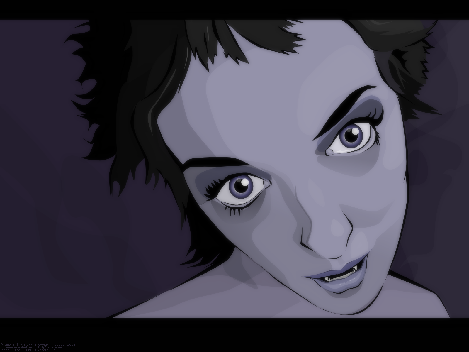 I wanted to make a vampire wallpaper, so I did… She kinda has a eerie and dazed look to her. Special thanks to Afra (audreystyle-stock.deviantart.com) for the excellent stock photo I used as a guide, her eyes are perfect for the piece. If you think this piece looks interesting, I urge you to download the full sized image, the thumbnail doesn’t do it justice.